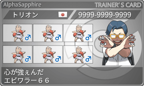 ** N N:ただの 種族値:50-105-79-35-110-76(455) **特 性:せいしんりょく 持ち物:ふうせん わ ざ:インファイト/マッハパンチ/がんせきふうじ/みきり 性 格:ようき 努力値:H4 A252 S252 実数値:126-157-99-45-130-140