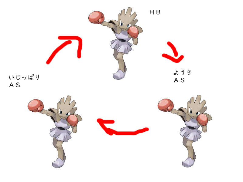 ** N N:じゃねぇぞ… 種族値:50-105-79-35-110-76(455) **特 性:せいしんりょく 持ち物:アッキのみ わ ざ:ドレインパンチ/ビルドアップ/マッハパンチ/みきり 性 格:いじっぱり 努力値:H252 A4 B252 実数値:157-138-131-49-130-96