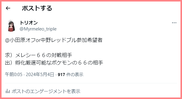 Twitter(現X)でエネコを用意したのが4人とのことだったので勝手にトーナメント表を作成。ダーマルコルさんが予選中だったので予選を先に終えていた私とリッチまつりさんで先にやっちゃおうということに。