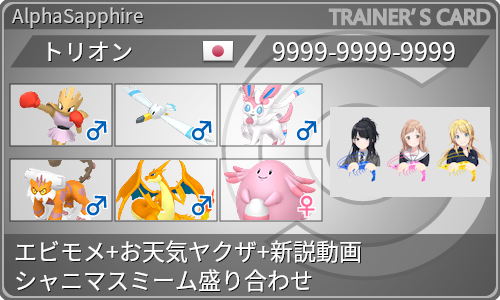 トリプルバトルのオフ会でメガリザYの採用理由お天気ヤクザなんですよ~といっても棺おけさんしか分からなかったみたいで全然うけなかった。