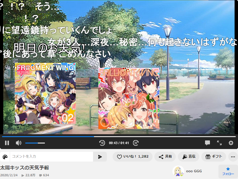 いわゆる「曲が会話するシリーズ」というもの。曲に含まれる歌詞で曲どうしを会話させる動画シリーズで、そこでイルミネ(エビを揉んでいるグループ)の曲、トライアングルが「明日の天気を他の曲に尋ね、晴れあることを要求する」というもの。