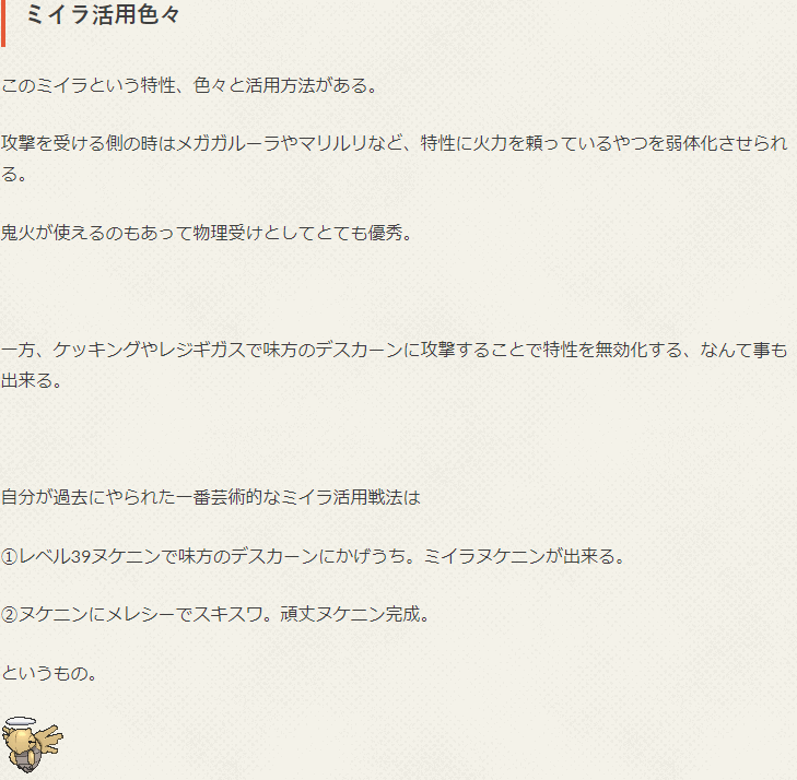 ガードシェア役兼ヌケニンにがんじょう渡す役。 一瞬ミイラヌケニンが誕生しアローに狩られるのを防ぐため岩の最大打点を採用。 オフ会ではやることねーなーで怒りの壺を奪ったら急所に当たりA+6メレシーが誕生する珍事件が起きた。